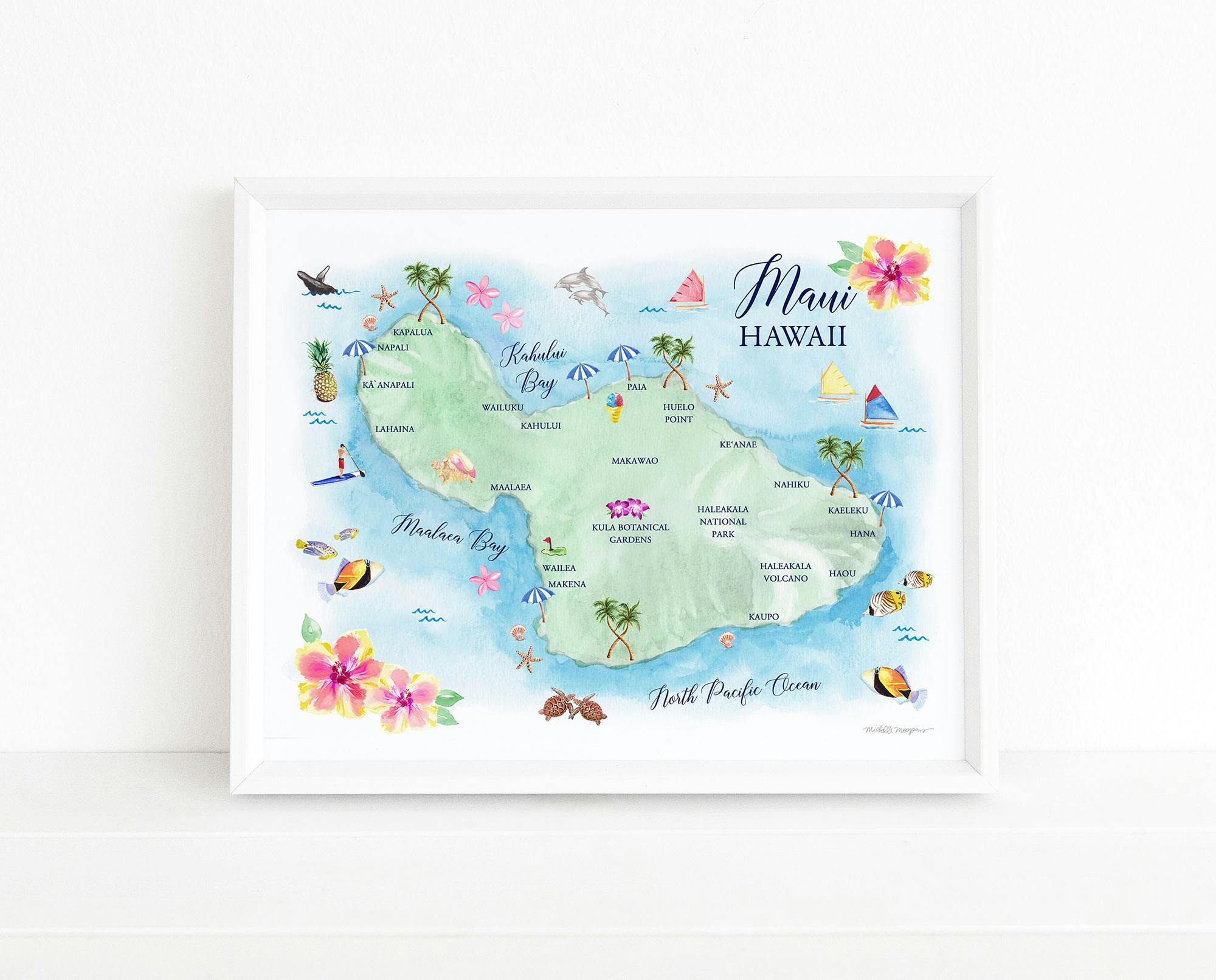 Original watercolor art print of Maui, Hawaii Map by artist Michelle Mospens. Printed in my USA studio on thick white cover stock with archival inks. This minimalist artwork brings the fresh summer memories into any home decor.